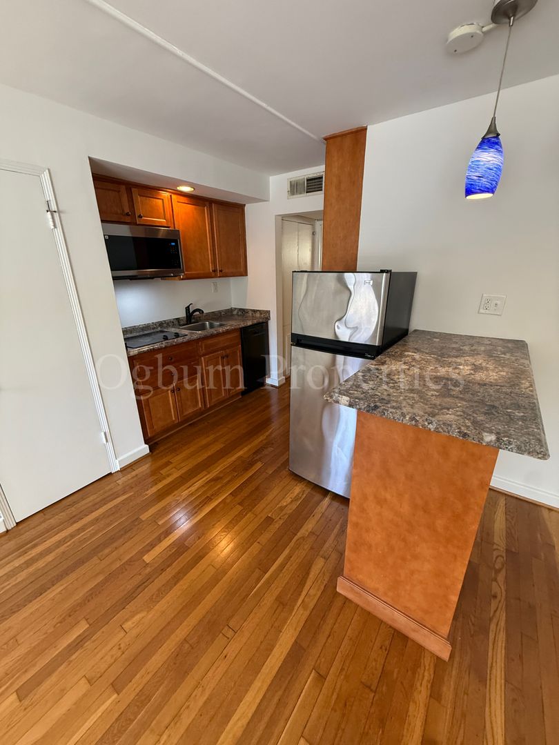 1BR/1BA, 1st Floor, LR W/ Built-In Counter, Cook Top, DW, SS R/Micro, Refinished Hardwood Floors, Heat Pump & Central A/C, Water Included.